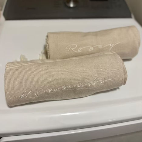 These towels are so cute! They came well packaged and all of the names were spelled correctly on each towel. The towels are thin and super great quality and very large!! I cannot wait to give them to my bridesmaids.